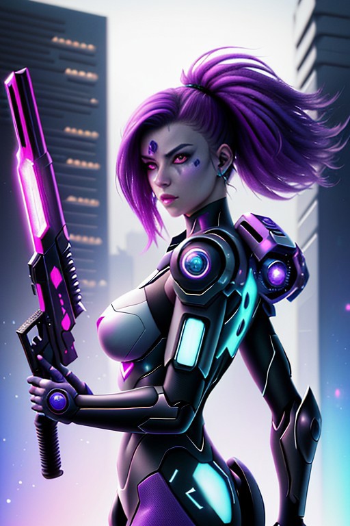 modelshoot style, 20yo cyberpunk woman in a futuristic cyberpunk city, posthuman, infinity the game, ghost in the shell , holding a weapon, anime look, scifi, light armour, neons, aleph, feminine face, detailed eyes, torso up, focus eye, one cyborg eye, one purple eye, best quality masterpiece, photorealistic, detailed, 8k, HDR,vaporwave, broad light, high contrast, backlighting, bloom, light sparkles, chromatic aberration, sharp focus, RAW color photo, high tech