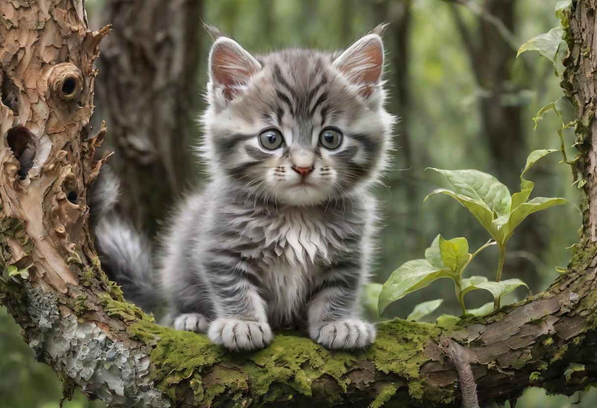 Silver grey Maincoon kitten in front, a baby squirrel sit on tree, A lush, verdant scene showcasing nature's unruly yet harmonious growth, sprawling forest greeneries flourish richly across the landscape, speckled spores clung on a faded-bark tree trunk, delicate ivy tendrils squirm through the canopy, obsidian creeper vines dangle heavy with ripe figures, backlit by the setting sun throwing yawning shadows across the dew speckled moss, sight line stretching into the misty horizon, digital render, breathtaking surreal,