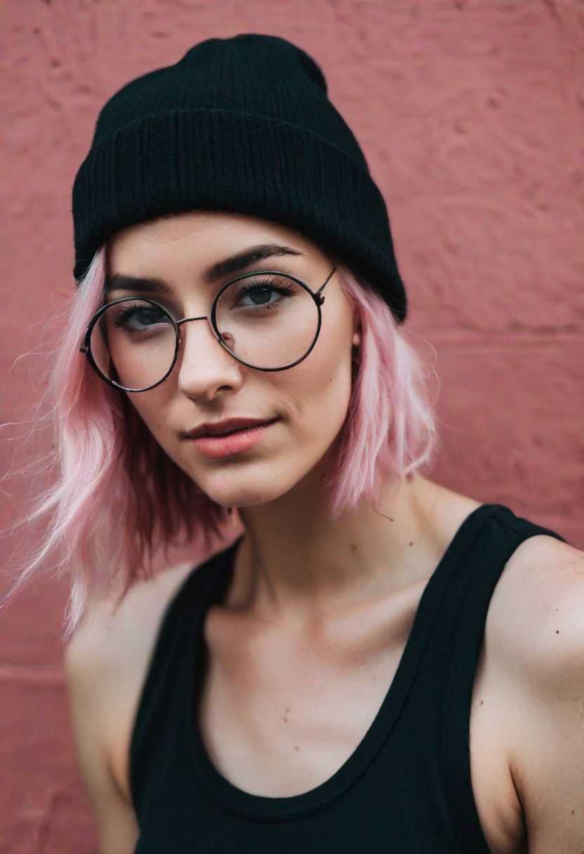(analog photo) portrait of a beautiful 25-year-old woman with pink hair with (round glasses:1.2) wearing a (black beanie:1.2) and wearing a tanktop, natural skin texture, realistic skin texture, (skin pores:0.8), (skin oils:0.8), fine art photography, award winning photography, Fujifilm XT3 photo