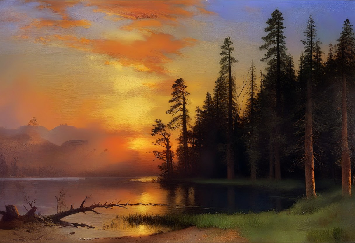 <lora:06NatureArt_Hap_XL:1>, Albert Bierstadt style, Vibrant and dynamic illustrations and vectors, artstation trending, 4k resolution, Masterpiece,highly detailed, <lora:add-detail-xl:0.0001> ,<lora:hand 4:0.0001>, A stunning sunset casts a warm, golden glow over a serene lakeside scene. Tall pine trees stand in stark contrast to the softly illuminated sky, which transitions from deep blue to vibrant orange. The calm waters of the lake reflect the dramatic colors of the sky and the dark silhouettes of the trees, creating a peaceful and contemplative atmosphere.