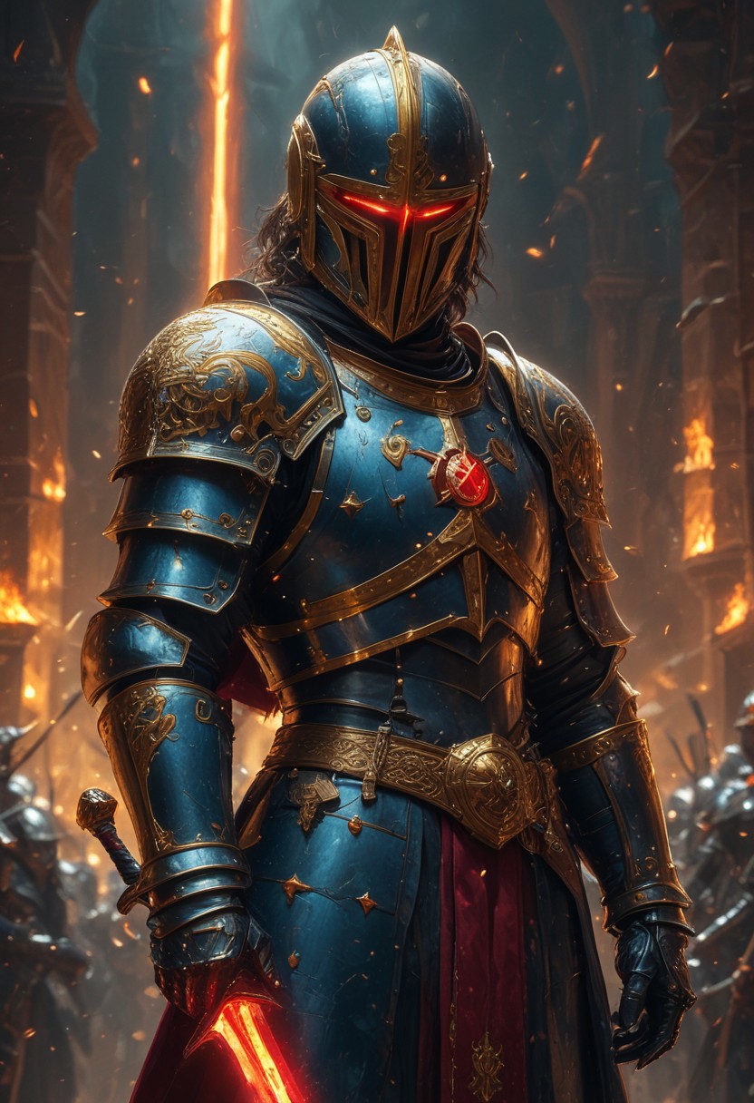 A knight in blue armor with a golden X on his chest and golden accents, red light shining through his helmet's visor, holding a ruby sword, full body shot, hkstyle, 1boy, holding ruby sword, blue armor, gold X symbol, full helmet with a single eye slit, (glowing red eyes), red aura, score_9, score_8_up, score_7_up, score_6_up, highres