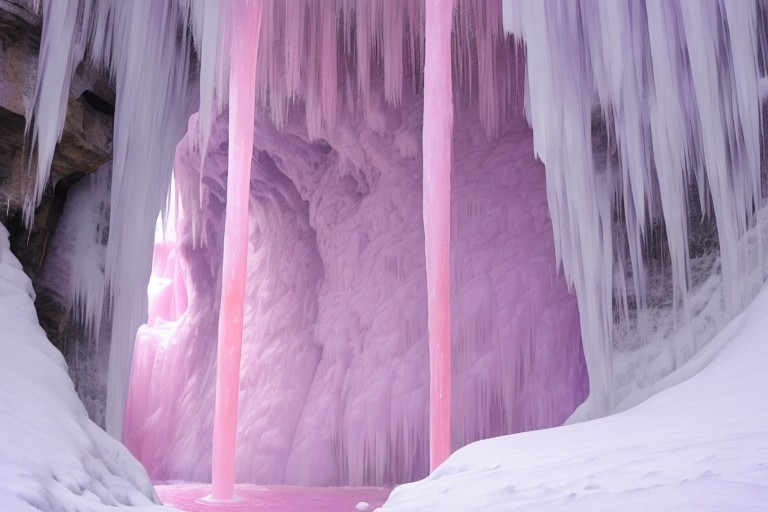 overlooking frosty mountain tops, icy glaciers, frost dripping clouds, very deep valley, waterfall, water flow, icefall, icicles hanging on the cliff, giant icicles, ice falling down, deep chasm, liquid water, water dripping from icicles, (((ice is pink color))), (((purple ice)))