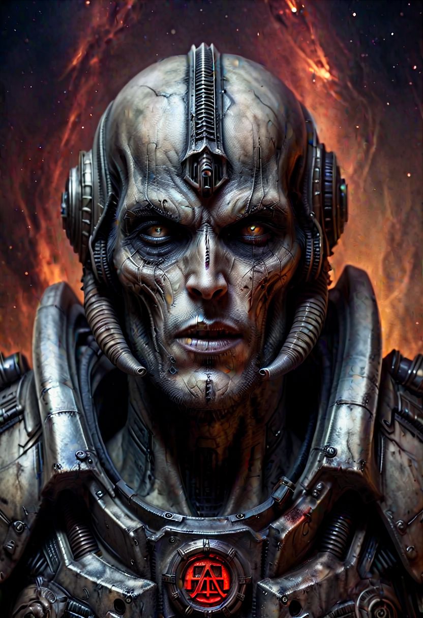 Space marine portrait oil stains mixed with((( doom sleer))) caste.WITH THE INSCRIPTION ((USSR)) on the helmet, H. R. Giger style but depicted as an oil painting waist portrait There is a space castle behind