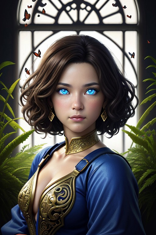 8k portrait beautiful cyborg brown curly hair huge breast intricate elegant highly detailed majestic digital photography (artgerm ruan jia greg rutkowski) surreal painting gold butterfly filigree broken glass (masterpiece sidelighting finely detailed beautiful symmetric blue neon eyes hdr detailed background window new dimension plants flowers<lora:more_details:0.5>