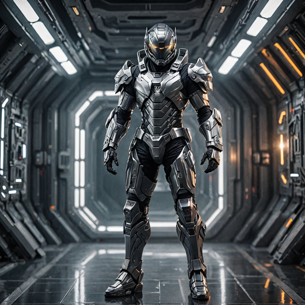 boy wearing a grey [high tech scifi armor:: 0.5] [coat:0.5], (fantastic), solo, confident, ultra-detailed, best shadow, beautiful face, best quality, masterpiece, 4k, prefect lighting, very aesthetic, art, full body, full growth, ((open cosmic background)),