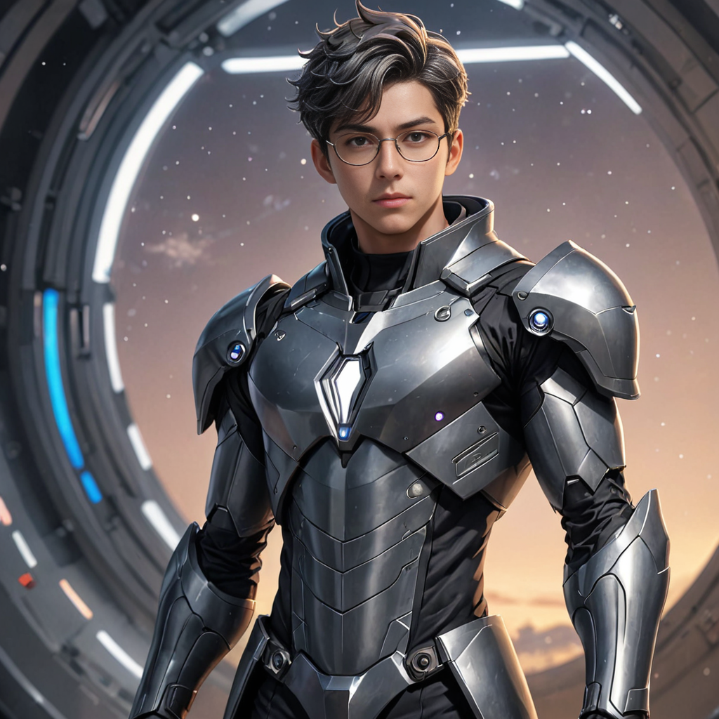 boy wearing a grey [high tech scifi armor:: 0.3] [coat:0.3], (fantastic), solo, confident, ultra-detailed, best shadow, beautiful face, best quality, masterpiece, 4k, prefect lighting, very aesthetic, art, anime, full body, full growth, ((open cosmic background)), eyeglasses