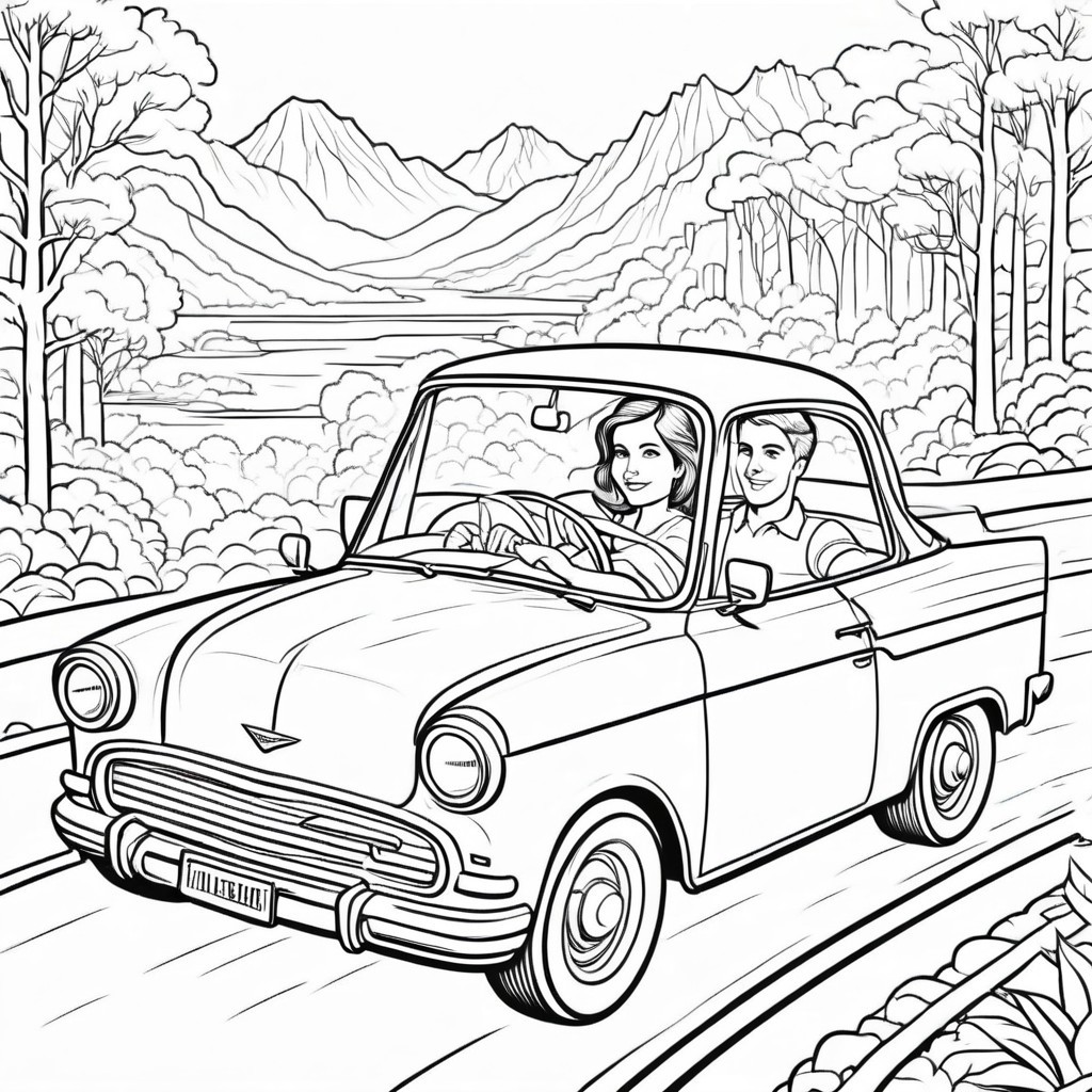 a coloring page with a girl and a boy in a car, coloring book outline, clean coloring book page, clean lineart, retro line art, simple line art, clean linework, perfect lineart, bold lineart, coloring pages, heavy lineart, simple lineart, line art illustration, line art colouring page, outlined hand drawn