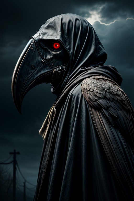 masterpiece, best quality, absurdres, illustration, photorealistic, cinematic lighting, dynamic angle, perfect composition, 1other, plague doctor, beaked mask, dark cloak, glowing eyes, raven perched on shoulder, ominous sky, feathered cloak, watchful gaze, darkened street, foreboding presence