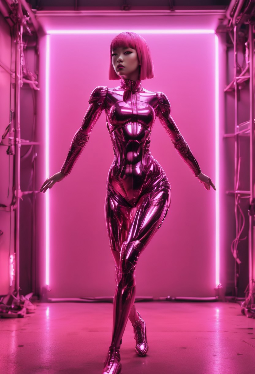 girl transforming into rubber doll, pink, shiny, full body, kneeling, legs apart, realistic face, 8k, gorgeous, hot, intricate, cinematic lighting, hyper detailed, best quality, ultra high res