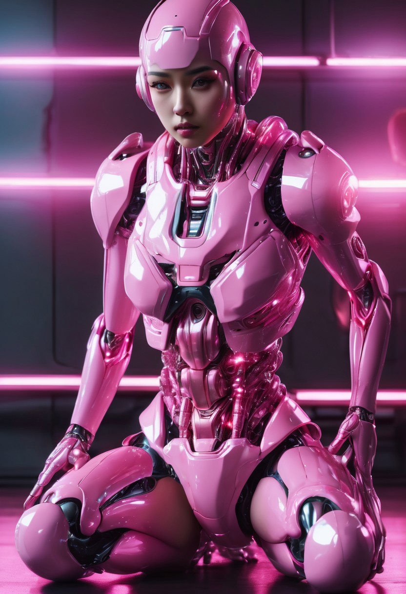 girl transforming into rubber doll, pink, shiny, full body, kneeling, legs apart, realistic face, 8k, gorgeous, hot, intricate, cinematic lighting, hyper detailed, best quality, ultra high res