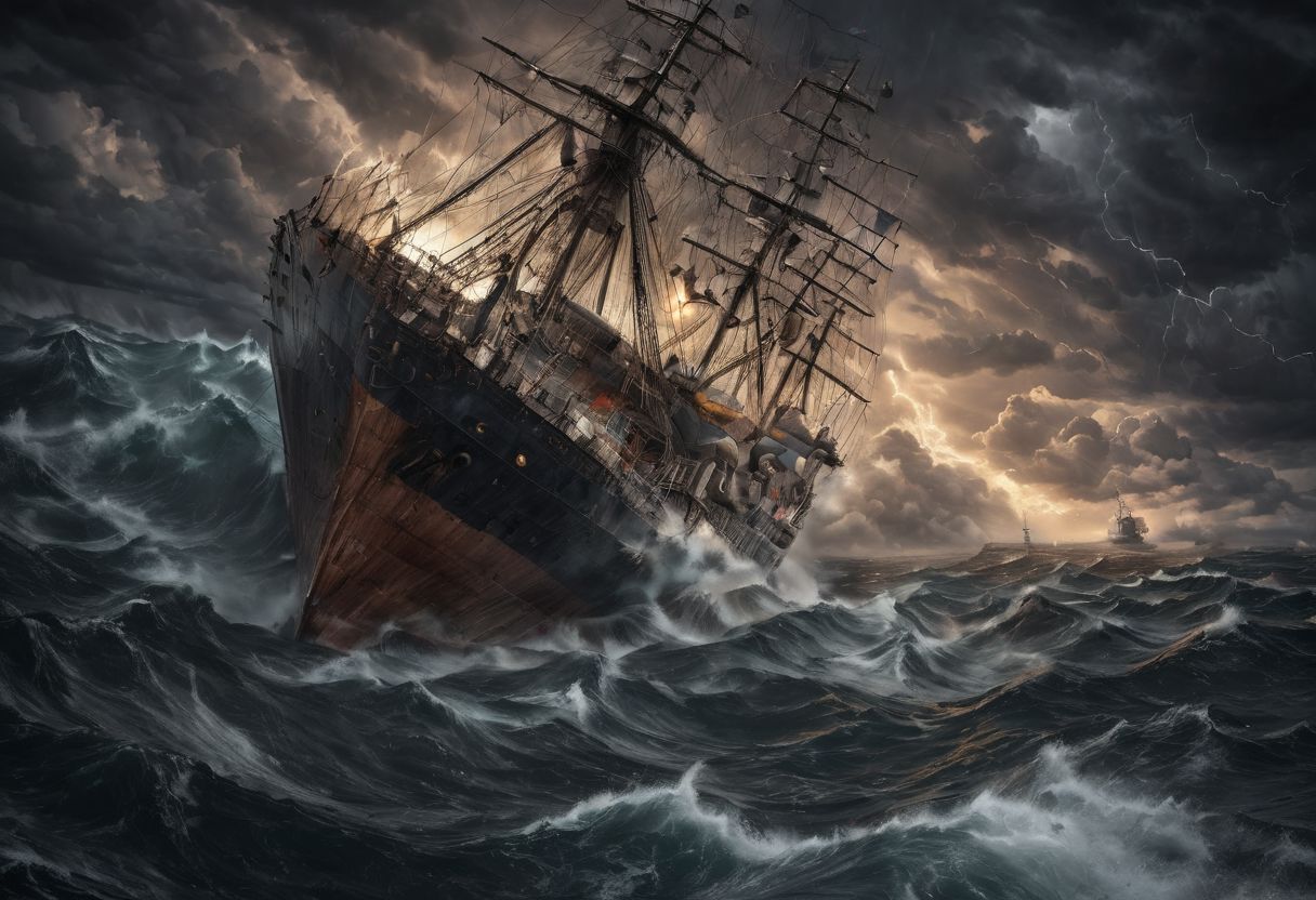 Generate an image depicting a dramatic storm at sea. high resolution, size 16/9, ultra HD quality, HDR Dramatic: The image should be visually stunning and convey the power and fury of the storm. Suspense: The image should create a sense of tension and danger, showing the ship's crew struggling to stay afloat. Detail: The image should be detailed enough to see the waves, the ship, the crew, and other elements of the storm. Realism: The image should be realistic and reflect the true appearance of the storm at sea. Fear in the eyes of the captain Colors: The image can use dark and dramatic colors to emphasize the tension of the situation. Lighting: The image can use flashes and other lighting effects to add drama. emphasis on the ship's crew after exactly the captain Image of ((ship's crew struggling to save the ship from the storm)) styles, for example: Realistic, funny