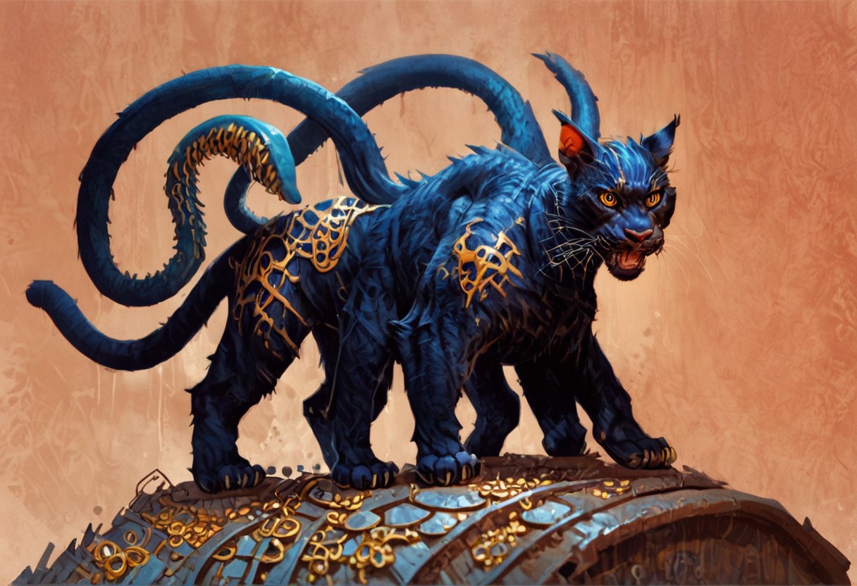 score_9, score_8_up, score_7_up,score_6_up, style_comic, rating_questionable, a tiny adorable panther curled up on a huge skull, short fur, large yellow cat eyes, displacer beast, 2 tentacles, feline body, indigo fur, iridescent fur, Background gold and silver coins, treasure