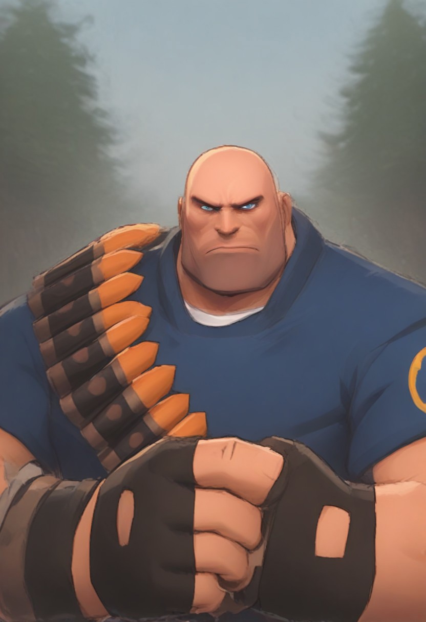 score_9, score_8_up, score_7_up, score_6_up, score_5_up, score_4_up, rating_questionable, TeamF2Heavy, outdoors, day, forest, bald, blue eyes, gloves, fingerless gloves, upper body, blue shirt, looking at viewer, bodybuilding, massive pectoral, neutral expression, tall, muscular, tall, Brawl, Thin Waist, Microwaist, Full Body
