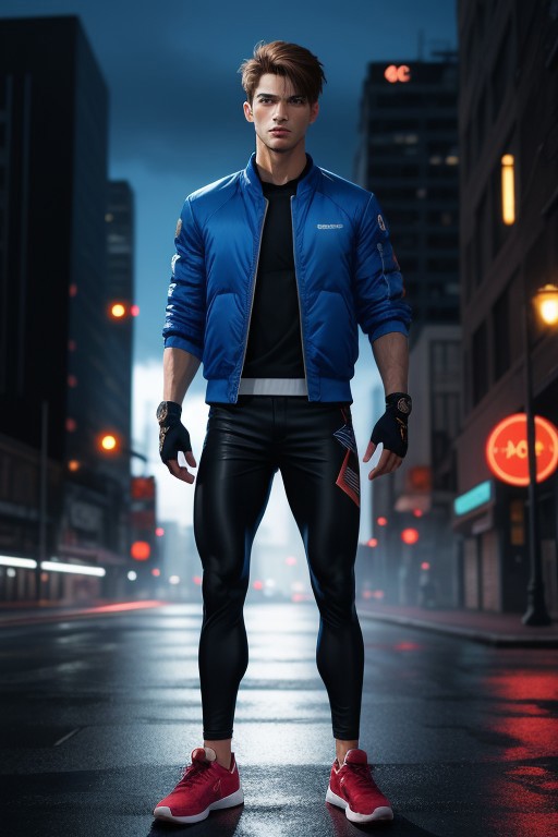 score_9, score_8_up, score_7_up, (high quality:1.2), wallpaper, absurdres, (very detailed:1.2), realistic, Expressiveh, 1man, solo, 18 years old, male focus, muscular boy, (short hair), skin cut hair, perfect masculine face, 18 year old, looking at viewer, (((perfect masculine face))), ((full body)), night with neon light, ace trainer_sm, sleeves blue jacket, blue shorts, black leggins, fingerless gloves, blue sneakers, standing, sexy male body, city background, detailed, masterpiece, best quality, best resolution, splashscreen, cinematic lighting, depth of field, epic, dramatic <lora:Expressive_H:1>,