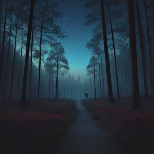 masterpiece, 8k, enchanted forest, beautiful sky, night, extremely detailed, slender black silhouette in the background, photorealistic