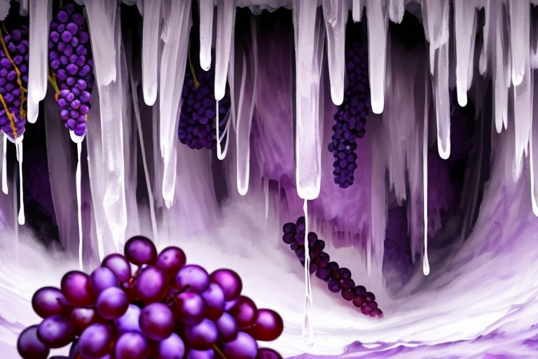 overlooking frosty mountain tops, icy glaciers, frost dripping clouds, very deep valley, waterfall, water flow, icefall, icicles hanging on the cliff, giant icicles, ice falling down, deep chasm, liquid water, water dripping from icicles, (((ice is purple grape color))), (((purple grape ice)))