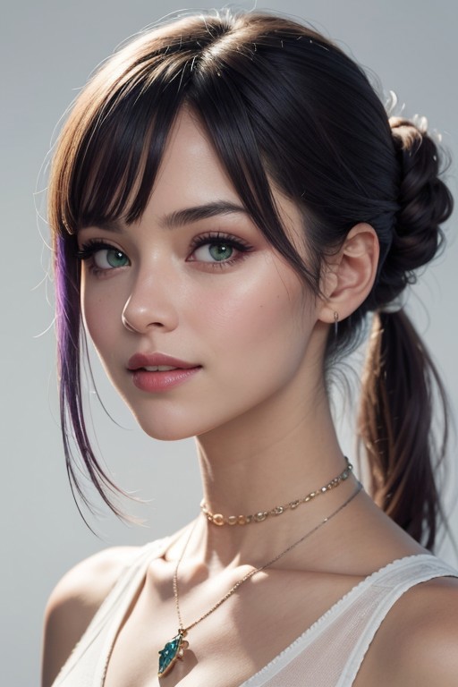 score_9, score_8_up, score_7_up, realistic lighting, photo, photorealistic 1girl, purple hair, necklace, (bangs:1.1), side view, (detailed face and eyes:1.2), white background, perfect cute face, turning to look at viewer, vibrant colours, cocky smile, choker, (freckles:0.6), eyeshadow, pigtail buns, round face, green eyes