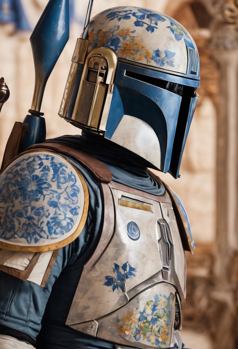 "Closeup boba fett with blue china floral decoupage armor, white and blue, floral, adire pattern" Weight:1 "detailed matte painting, deep color, fantastical, intricate detail, splash screen, complementary colors, fantasy concept art, 8k resolution trending on Artstation Unreal Engine 5" Weight:0.9