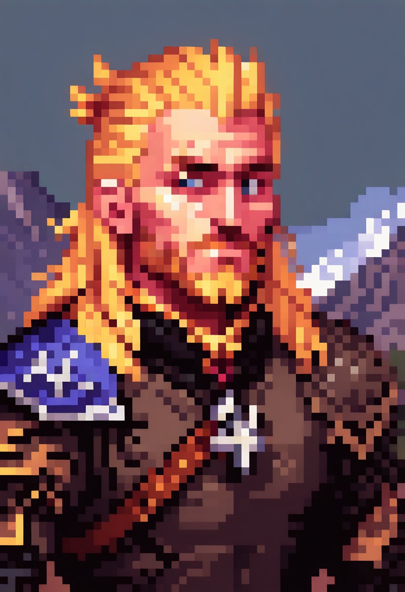 a jrpg in pixel art, blond hair and beard, dark dead mountaineer with black big whiplash, very detailed, gorgeous