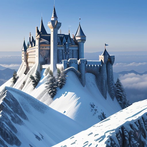 mountain castles, in ice and snow, fortified but comforting, on top of a mighty mountain in large mountain range, great bridges connect the castle to other towers on other mountains forming a great castle network