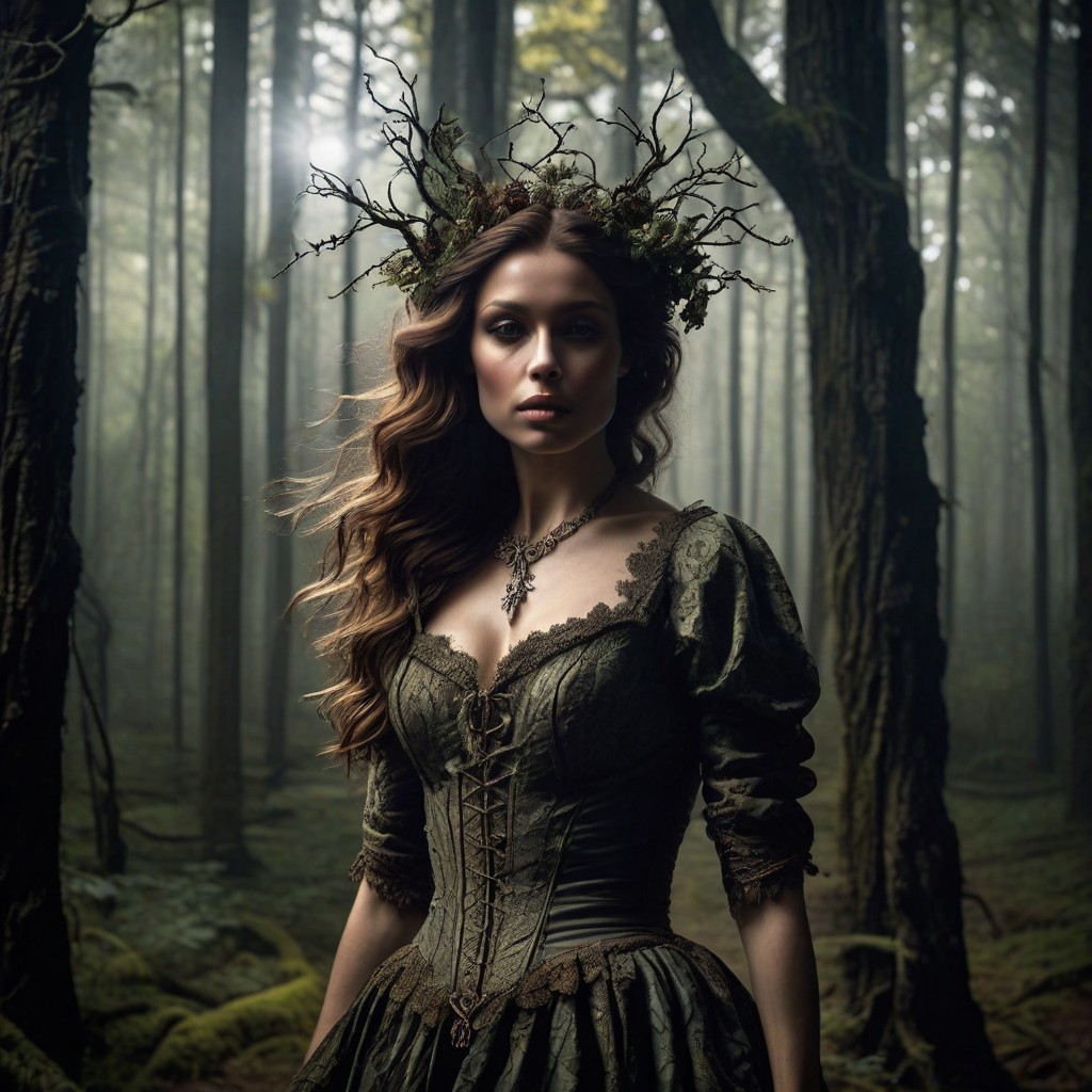 darkness, (rembrandt lighting:1.4),((masterpiece)), ((best quality)), (ultra-detailed), ((extremely detailed cg)), earth tone color palette, ((an extremely delicate)), (perfect lighting), ((8k)), (dynamic angle), (sharp image), depth of field, rich in details and textures, light particles, Lens flare, Fine dust reflected in light, A woman blending into a tree, morphed into a tree in a large forest, forest path at midnight, dark night, a female dryad morphed into a tree, a beautiful dryad, medium breasts, (grin:0.8), dark-mist, pensive expression, one iron torch lit on the forest path, BREAK Artistic, memorable masterpieces, face focus, Strong wind blowing, American Horror, forested horror background, Horror background, American Horror style, American Horror image,