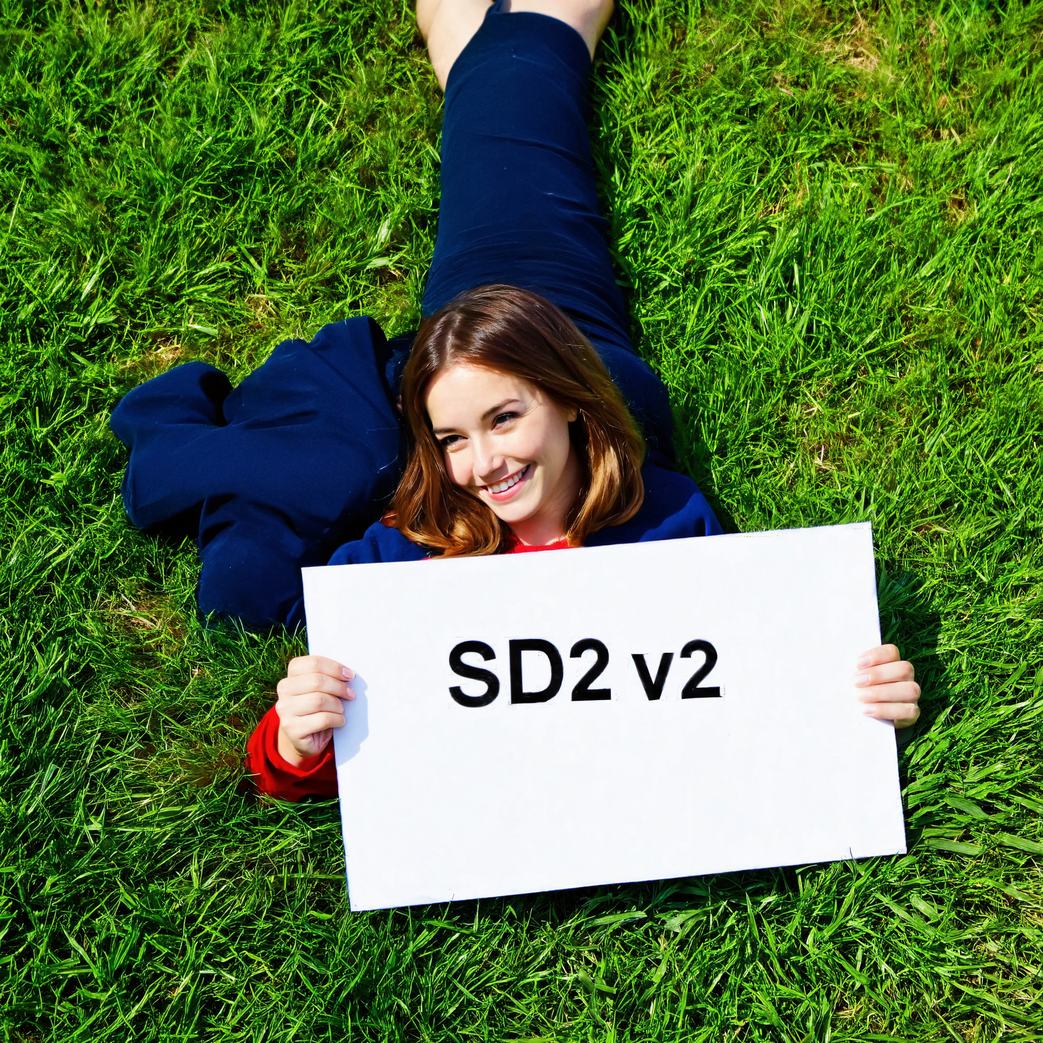 A woman lying on the grass holding a sign saying "SD2 v2"
