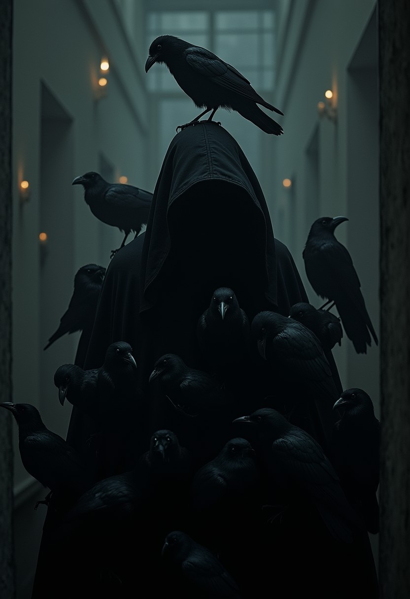 realistic quality photo, retro photo, person in black mantle surrounded by crows, crow on the shoulder, crow on top of the hood, old mansion background, in the dark corner behind many glowing eyes, creepy atmosphere,