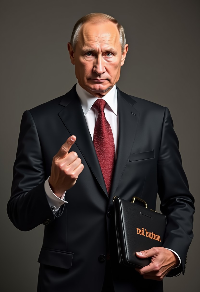President Putin, dressed in a formal suit, shows his middle finger, and in his other hand holds a briefcase with the inscription "red button"