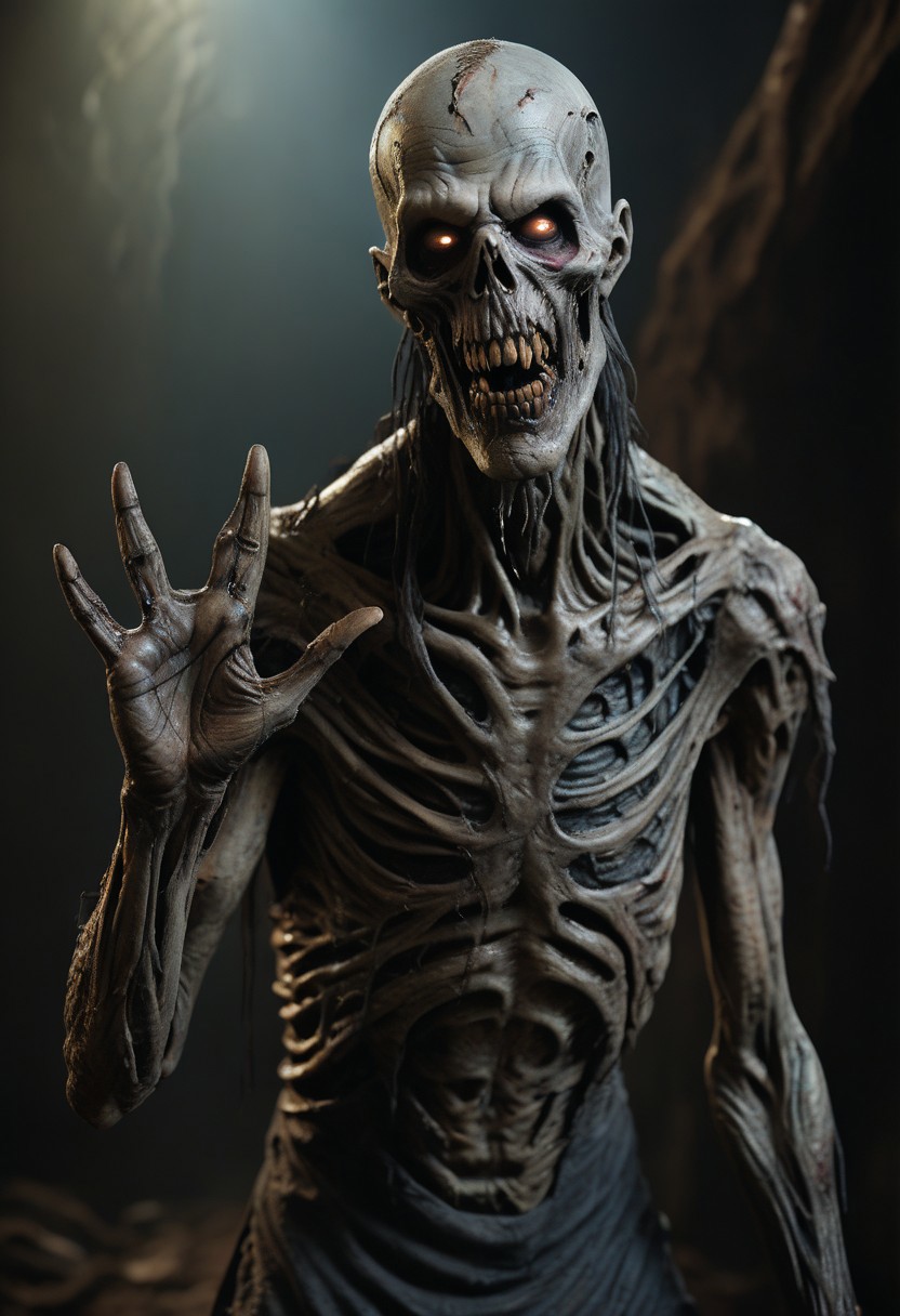 Realistic depiction of a ghoul, with detailed decaying skin and sharp teeth, turning towards the viewer with its left hand up raised in a "live long and prosper" gesture. Inspired by the works of H.R. Giger and Clive Barker, this digital painting showcases intricate details and lighting to bring the ghoul to life. Perfect for horror or sci-fi concept art, this piece is rendered in high resolution using ZBrush and Photoshop techniques. solo focus, negative space, ray tracing, high key, insanely good quality