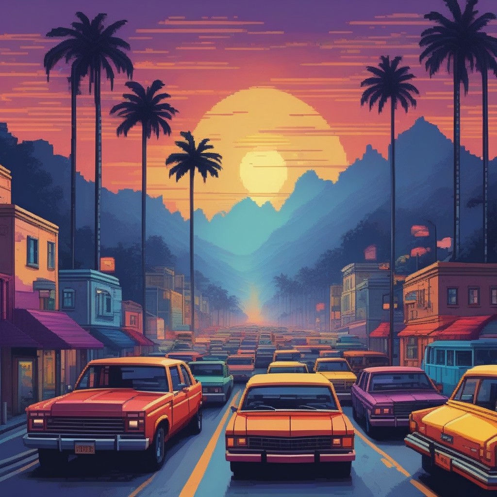 masterpiece, best quality, very aesthetic, absurdres, pixel art, wide shot, ( no human:1.2), single point perspective,( heavy traffic jam:1.5), on a coastline, palm tree, retro wave color, twilight,