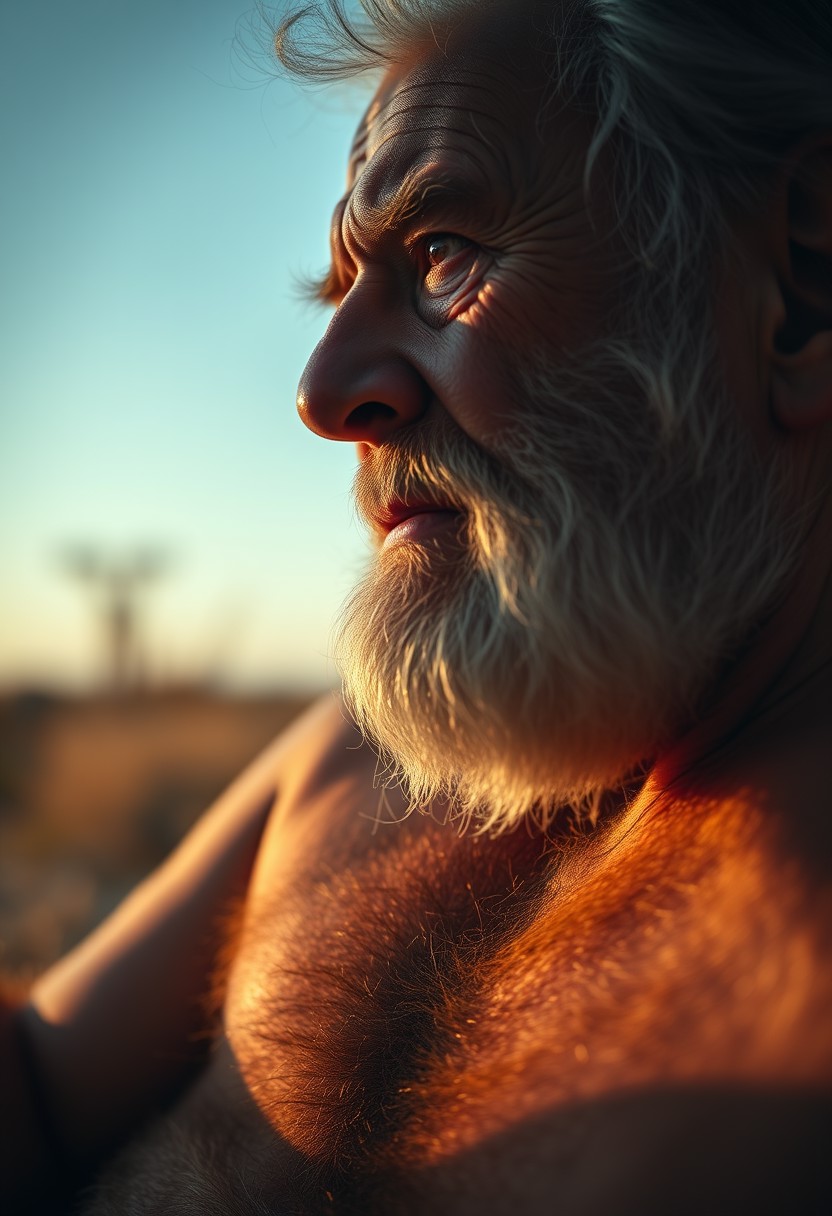 Romantic movie scene, cinematic atmosphere, arthouse film, Dynamic Closeup from the side, Old hairy tanned grandpa, hairy chest, warum Volumetric sunrays on chesthair, doublechin, gentle expression, looking at viewer, doublechin, pov side, dawn, dusk, moaning softly in pleasure