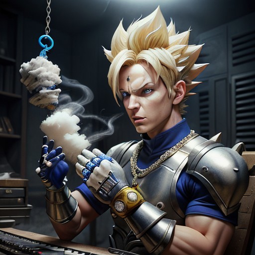 recstudio vegeta rapping, solo, blonde hair, gloves, 1boy, upper body, male focus, white and blue Super Saiyan armor,blue eyes, spiked hair, smoke filled room, jewelry