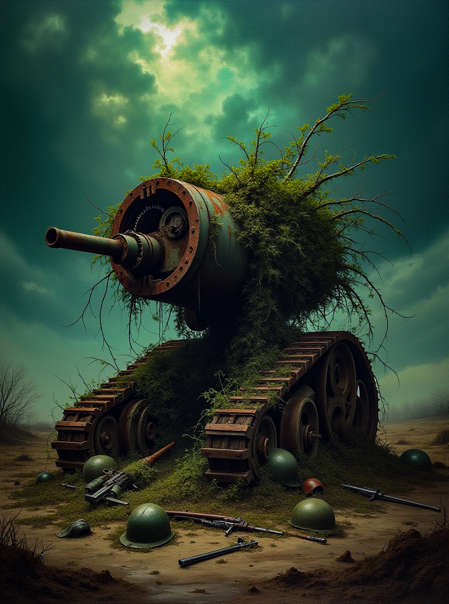 A decaying war machine stands in the middle of a deserted battlefield, its rusted gears and twisted metal parts overgrown with vines and thorns. Soldiers' helmets and weapons lie scattered around its base, half-buried in the mud. The machine, once a symbol of technological might, is now a relic, slowly being reclaimed by nature. The sky is a swirling mix of dark clouds and sickly green light, creating a stark juxtaposition between the remnants of war and the slow return of life. The painting style is influenced by Zawadzki's organic surrealism, merging the natural and the mechanical in a haunting reflection on the passage of time.