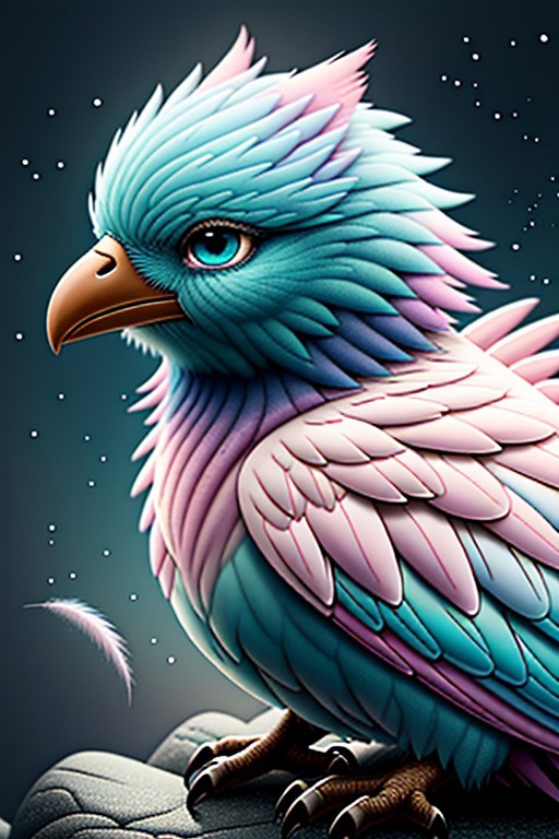 hyper-detailed, Cute fantasy character illustration, close-up of an adorably fluffy creature with oversized, expressive brown eyes, its fur is a mix of soft white and pastel pink, with vibrant blue and pink feathers sticking out playfully from its back, the creature is sitting on a rock, bathed in soft, magical lighting that highlights its gentle fur texture, the background is a dreamy, blurred teal and dark blue, with tiny glowing particles floating around, the overall mood is whimsical and enchanting, evoking a sense of innocence and wonder.