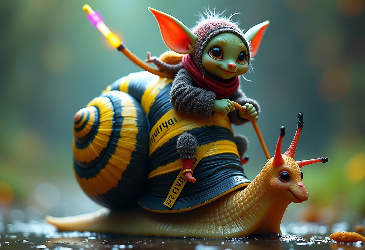 a tiny goblin jockey riding on the back of a giant snail, neon reins,the snail's shell is striped black and yellow and wrapped with yellow caution tape reading "civitai", slime trail, neon bokeh, in the style of a fantasy painting