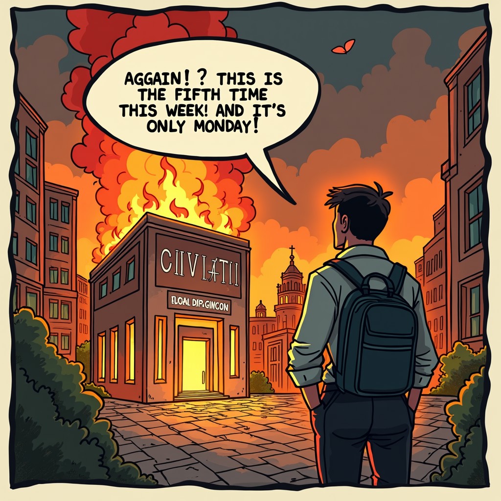 Create an image in the style of a comic about a man looking at a burning "Civitai" building and saying to himself "AGAIN!? THIS IS THE FIFTH TIME THIS WEEK! AND IT'S ONLY MONDAY!"
