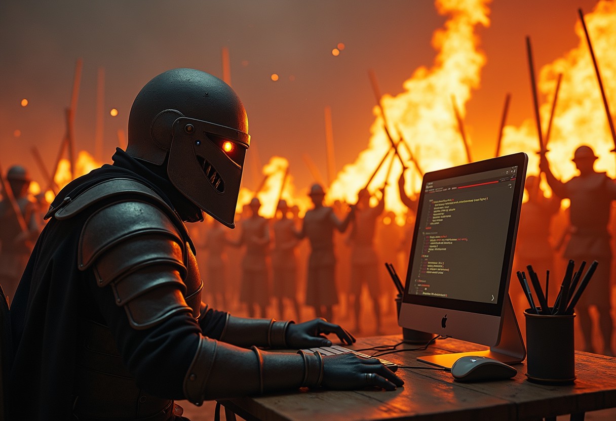 I'm a programmer knight fighting against an army of influencers with swords made out of mobile phones while I'm sitting at my computer charging at them with fire coming out of their eyes and mouths. They open their mouths like a mummy 3 and let out a fiery scream and attack me. Our junk is in the middle of Pars Olympics. They are not wearing armor and are dressed like Instagram actors