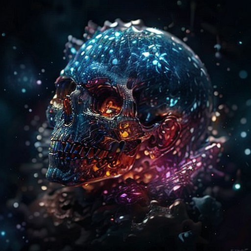 In the vast emptiness of the interstellar void, blue crystal skull omnipotent deities from separate dimensions collide. The Creator, a deity whose face is an ever-evolving canvas of galaxies and life, wields the power of creation, bringing forth stars, planets, and life forms with a wave of their hand. Opposite them stands the Destroyer, a god whose face is a shifting visage of decay and entropy, wielding the power of destruction, disintegrating celestial bodies and extinguishing stars. The clash of creation and destruction is a cosmic spectacle, with galaxies being born and dying in the wake of their unimaginable powers. highest quality, enhanced quality, creative, beautiful, vibrant, masterpiece, 8k, amazing details, amazing quality, amazing artist, sharp edges, detailed textures, full view, atmospheric lighting, amazing visuals, crystals fantasy, crystals, crystal, bg_imgs, cry5t415ku11, side view,