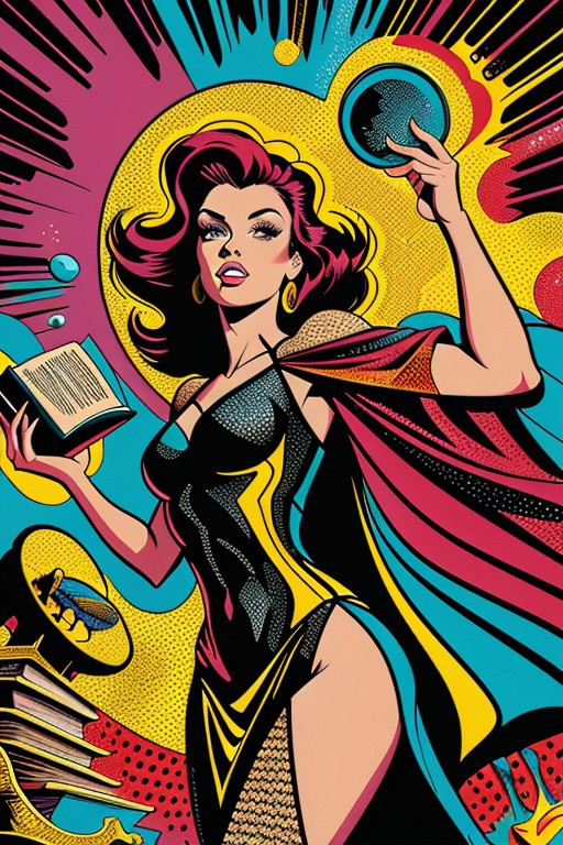 Create a vibrant pop art image of a Epic fantasy scene of a seductive sorceress with flowing dark hair, wearing a revealing, intricate and provocative gown with delicate lace, standing over a bubbling cauldron with glowing pink potion, surrounded by shelves filled with magical ingredients and ancient books in a dimly lit, mysterious forest, evoking an atmosphere of enchantment and allure, in the style of Boris Vallejo, Render this scene with high-contrast colors, sharp lines, and a retro pop art style, reminiscent of Roy Lichtenstein. Emphasize bold outlines and a flat, comic-like aesthetic to capture the energetic and playful spirit of pop art. from below,