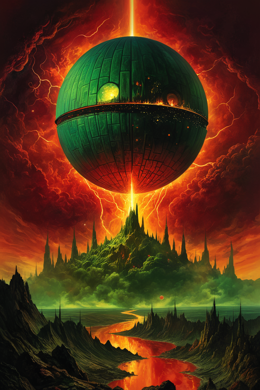best quality, masterpiece, absurdes, a painting of a giant Dyson sphere in the of a green and red sky, concept art, gothic art, science fiction, (acid bleeding deep colors:1.4), leaking, evil energy, no gradients, multidimensionality, complexity, black hole, neutron bombardment, inspired by Marc Simonetti, krenzcushart, Josh Kirby, alfred kubin, mysterious, eerie atmosphere, dark fantasy art, scary color art, Grisaille, wallpaper, devouring a planet, sky on fire, dying world, dystopian, hellscape, dark atmosphere illustration, uhd 4 k, fractal landscape, (no humans:1.3), painted in high resolution, colorful, primary colors, close-up,forced perspective, vanishing point, <lora:ptm0:0.4> ptm0 <lora:John Harris Style:0.35> John Harris Style page <lora:tbh160-sdxl:0.35> style of Dan Mumford <lora:marcXL:0.4>