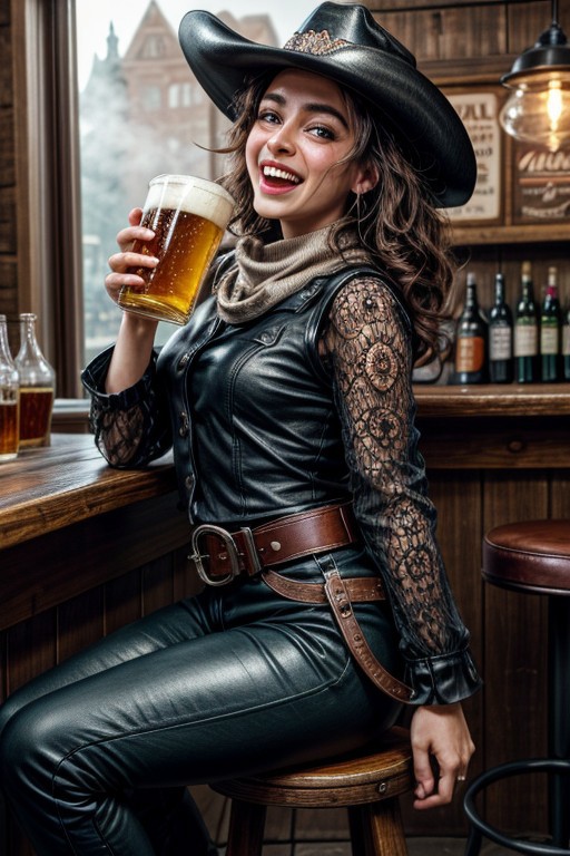 (RAW photo, 8k uhd, Analog style, Masterpiece, Best Quality, Highres:1.3), (dramatic, cinematic:1.2), BREAK, movie shot of (steampunk:1.1) (cybernetic:1.3) perky (latina:1.2) girl, (robot, android:1.3), cute cowgirl, (leather cowboy (vest:1.03):1.1), (pants:1.1), (black (shirt:1.03):1.1), (belt, holster:1.2), (cowboy (hat:1.05):1.2), boots, scarf, curly black hair, brown eyes, (laughing:1.3), happy expression, (from side:1.05), looking at viewer, sweaty, tan, (sitting:1.3) on wooden (stool:1.2) in (wild west saloon:1.2) room, BREAK, (holding beer:1.26) (mug:1.1), foam, (hand on hip:0.5), detailed wooden crowded wide (tavern interior:1.2), messy, ((window:1.1), entrance, table:1.1), ((bar:1.1) counter:1.1), barrel, (window sunlight:1.1), (light particles:1.1), fog, (overgrown street outside:1.2), (wild west:1.2), science fiction, (Western movie style:1.2), (vintage, retro:1.2), film grain, (intricate:1.4), light theme, (raising hand:1.0), party mood, drinking beer, BREAK, (Clutter-Home:0.5) <lora:more_details:1.0>, <lora:emotion_happy_slider_v1:1.0>, <lora:zoom_slider_v1:4.2>,