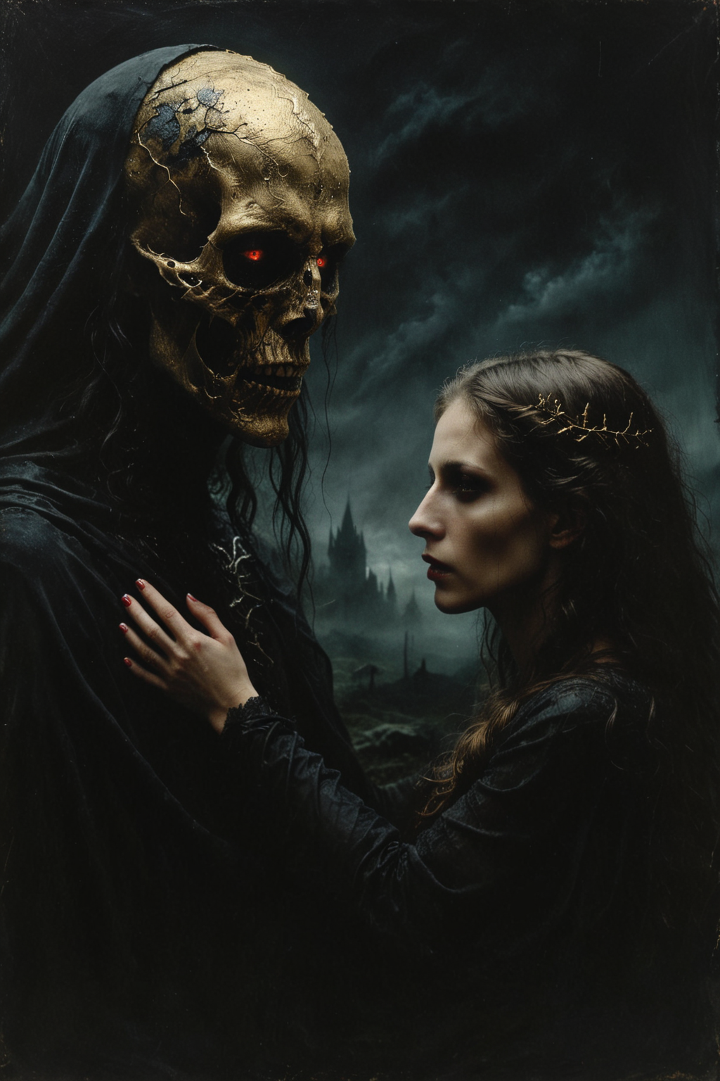 Mother Tell your children not to walk my way Tell your children not to hear my words What they mean What they say Can you keep them in the dark for life? Can you hide them from the waiting world? Oh mother Father Gonna take your daughter out tonight Gonna show her my world Oh father Not about to see your light But if you wanna find hell with me I can show you what it's like 'Til you're bleeding Tell your children not to hold my hand Tell your children not to understand Oh mother Father Do you wanna bang heads with me? Do you wanna feel everything? Oh father Yeah best quality, masterpiece, paranormal, entity, demonic, vampire, mysterious, darkness, grim, aesthetic, moonlight, glow, evil silhouettes, light particles, family, size difference, age difference,glowing eyes, dragan bibin, nicola samori, andrei riabovitchev, Zdzislaw Beksinski, close-up, <lora:DonMV31l0fD4rkn355XL:0.5> DonMV31l0fD4rkn355XL <lora:Desolation:0.4> <lora:EldritchCandids1.1.2:0.4> <lora:novuschroma27 style_b:0.45> novuschroma27 style, gold foil <lora:Kodak Motion Picture Film Style v4:0.35> Kodak Motion Picture Film Style, Kodak Motion Picture Film