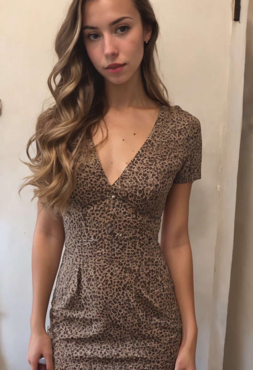 20 year old, European, woman, b cup breasts, 100 lbs, curdled hair, brown hair with blonde highlights, slight frekels, nerdy, sexy, slutty, sexy dress, low cut, form fitting