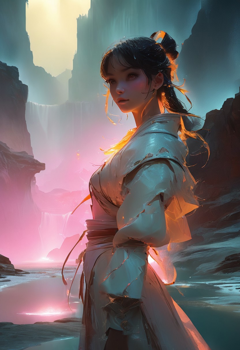score_9, score_8_up, score_8_up, ((Cinematic composition)),((masterpiece)), (resplendent lighting), absurdres, very fine detail, 8k. (1girl, beautiful girl, ((full body)) futuristic left-half cyborg and right-side demoness) in an action spell-casting pose, summoning her magics, glowing light swirl in orbit around her, sly smile. Beautiful and dangerous atmosphere. Standing in water gushing like waterfalls from high up the building. Resplendent spotlight highlighting, cinematic composition and lighting. Masterpiece.