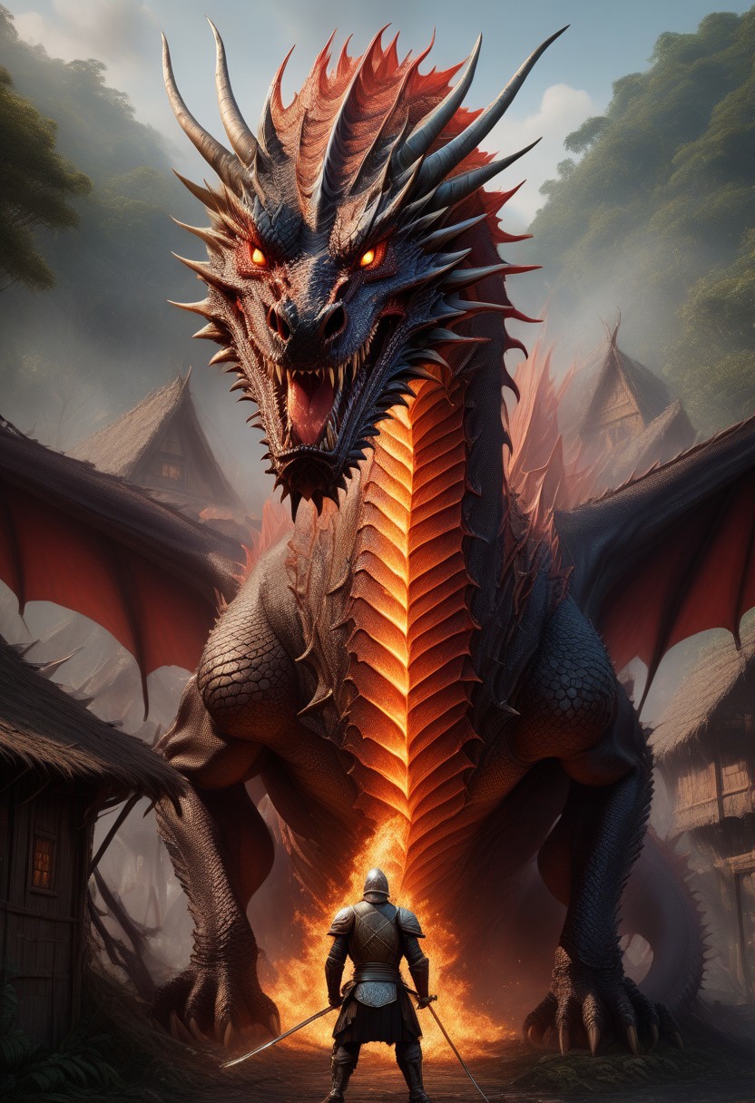 ultra realistic and quality image with high resolution and sharp focus photorealistic style, with ultra photo detail, of a sinister fire dragon burning a small village in the jungle, the village is made of wooden houses, ratio 1:1.5, ((a horseman in armor facing towards the dragon, he tries to pierce it with his spear))