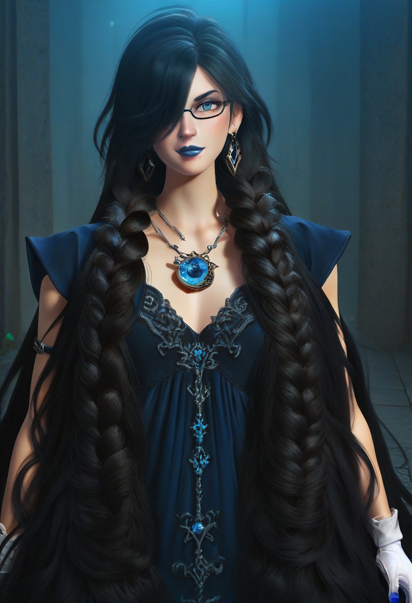 score_9_up, score_8_up, score_7_up, castle background, dark theme, low light, character focus, female focus, eyeglasses, blue triangle earrings, Blue Gem necklace, Blue Lipstick, (closeup, upper body, cowboy shot), (black hair, hair over one eye, absurdly long hair, very long hair, floor length hair, twin braids:1.2), Umbra Witch Black Dress, White Gloves, <lora:add-detail-xl:1.5>