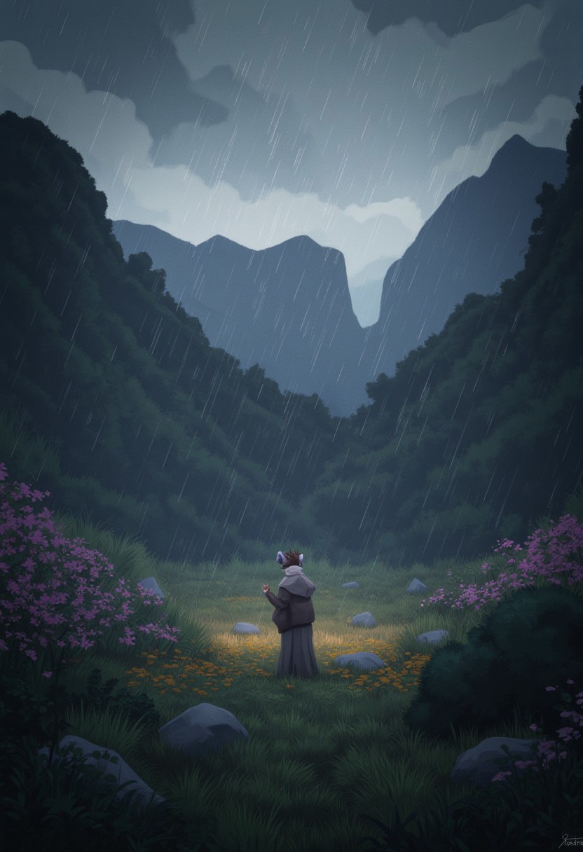 (((Barefoot furry character, full body, cinematic setting, furry boy, anthro, plantigrade))), (((2D))), (((plain animation))), (((anime))), (((by meesh))), (by zourik). RAIN (((rain keeps falling down))) - down into the rivers of life into the oceans of this world and back up into the sky (((mountains of gold))) are shrinking in time they vanish into space revealing your true face what is the meaning of all that is? just for a start... I can feel your (((smile))) right in my heart time is calling name by name come back to me enchanted by the sound the souls swirl around and around time is calling name by name come back to me enchanted by the sound my soul bursts into flames BREAK, intricate details, highly detailed, extreme detail, octane render, fine art, best quality, highres, (detailed face:1.5), ((full_body)), UHD, (((perfect hands))), ((low light:1.5))