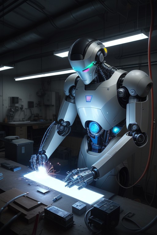 a robot man repairing his cyber arm with a welder, the man is in a futuristic garage, in the background there is a monitor with a technical draw of arm project. The man is focused on his arm. The arm is cybernetic, white shiny metal and crhome metal. The ambient is a futuristic laboratory. Above the scene there is a red neon sign with the write [MAINTENANCE MODE]. cinematic lighting, masterpiece, realistic, soffuse lighting