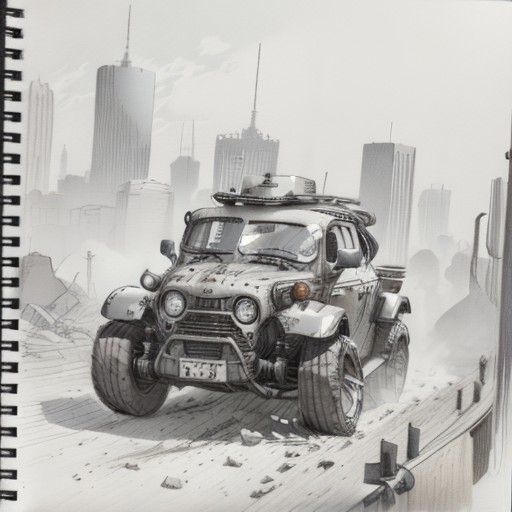 high detailed, perspective, forced perspective, dynamic angle, diselpunk car, vehicle, retrofuturistic, city street, skyscrapers, sketch, monochrome, greyscale, traditional media,