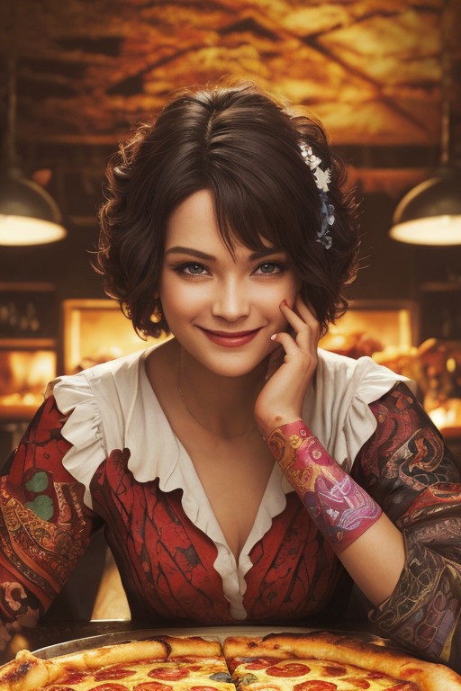 Cuisine, A smiling woman wears a dress made of pizza as she lays on a table, rich deep colors, intricate artwork, masterpiece, vibrant, ultra high quality model, improve eyes, cinematic, 4k, epic, sharp focus, 4k resolution blade runner